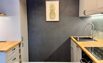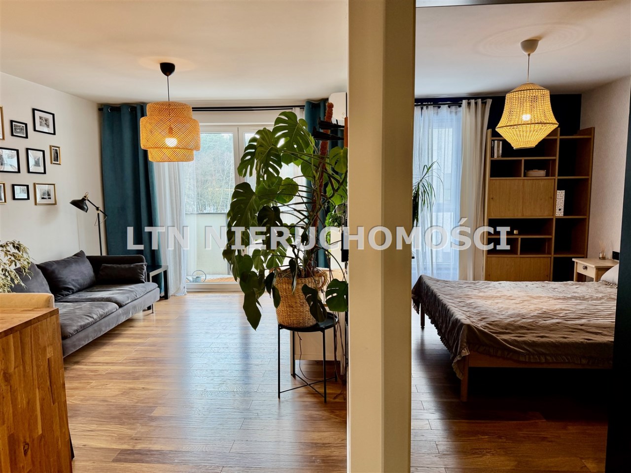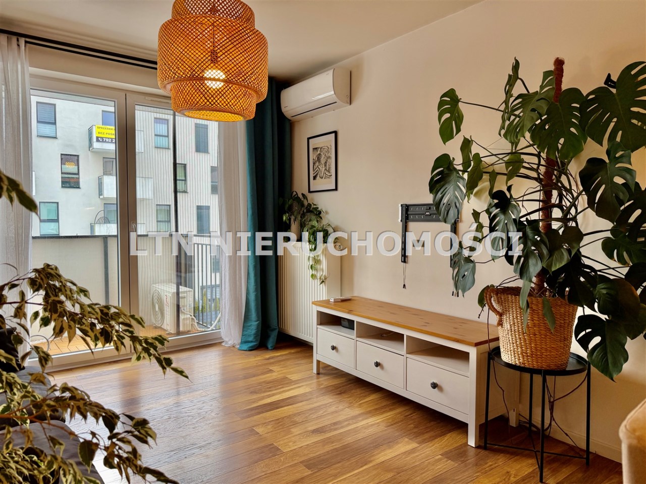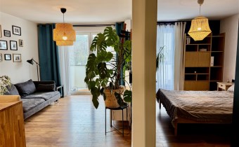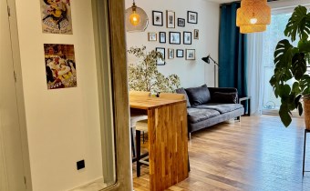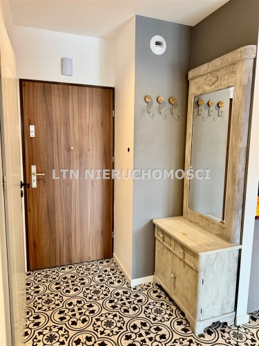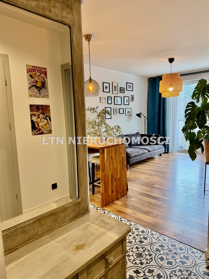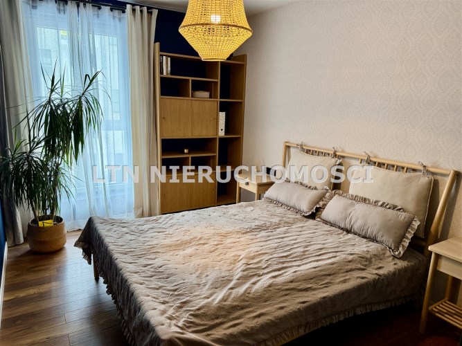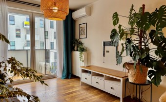 Mieszkanie składa się z salonu z aneksem kuchennym, sypialni oraz łazienki. Wnętrze jest w pełni umeblowane i wyposażone w sprzęty AGD oraz klimatyzację. Dodatkowym atutem jest balkon z widokiem na zieleń oraz komórka lokatorska.