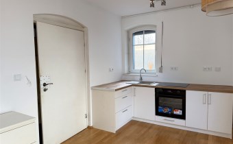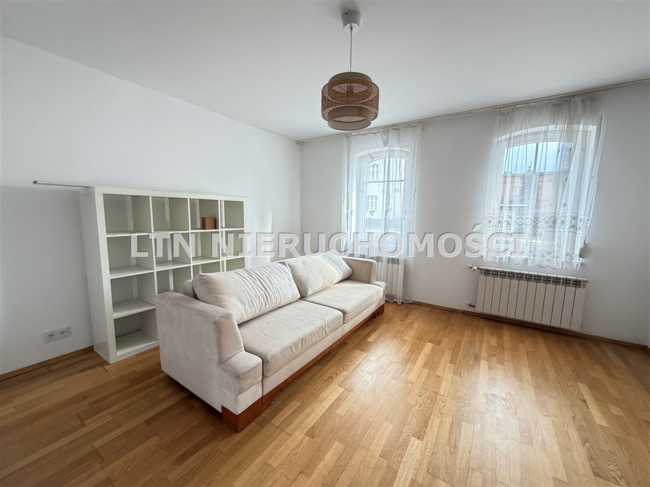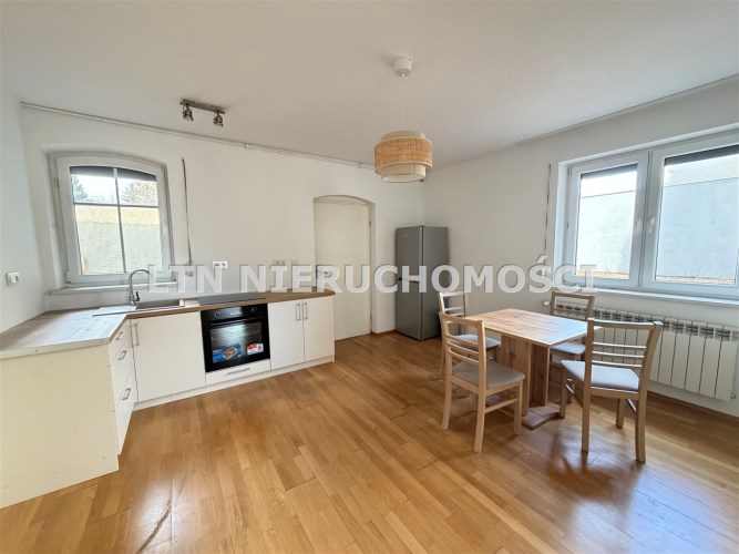 Mieszkanie ∼50 m², parter w domu wielorodzinnym – pokój dzienny z kuchnią, sypialnia, łazienka. Po remoncie: drewniana podłoga, jasne kolory, dużo szaf.