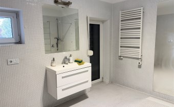 Łazienka z prysznicem walk-in, dużą taflą szkła, podwójnym grzejnikiem i oknem.